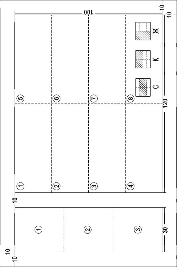 Площадь правого прямоугольника, состоящего из 8 частей, окрасить тремя основными красками, с перекрытием некоторых частей. Окраску начинать с темных цветов, например: 2, 3, 6, 7 прямоугольники окрасить синей краской; 1, 2, 5, 6 — красной; 1, 2, 3, 4 прямоугольники — желтой краской. При наложении одной прозрачной краски на другую в перекрывающихся частях образуются новые производные цвета, а прямоугольник 8 остается белым. Схема, приведенная в этом прямоугольнике и показывающая последовательность окраски, не вычерчивается.
