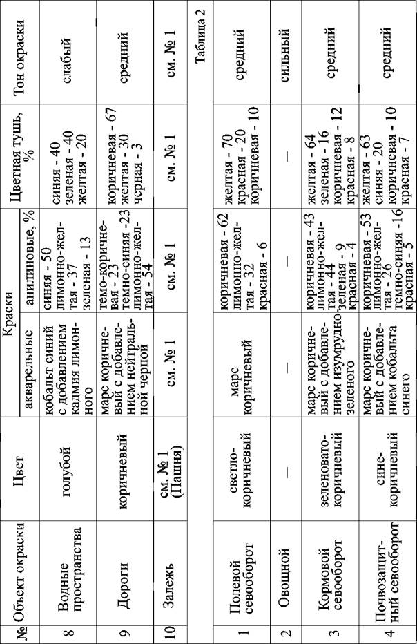 В основу окраски контуров пашни, а также запроектированных к освоению в пашню пахотнопригодных земель из других угодий, положен принцип окраски по севооборотным массивам, которые окрашиваются растворами красок, приведенными в таблице №2.