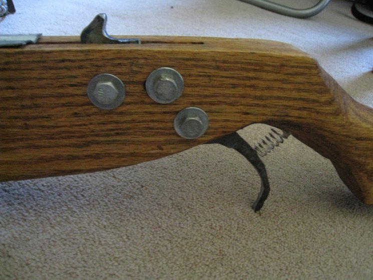 Теперь перейдем к спусковой конструкции, её можно сделать такой же, как и в первом варианте, но для того, чтобы сделать мощный арбалет своими руками необходима более надежная конструкция механизма.
