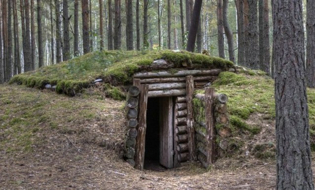 Землянка – это углублённое в земле сооружение, перекрытое бревнами, жердями, и присыпанное сверху грунтом, травой, листвой. Это идеальное жилище для выживания в лесу, но возводится оно не так быстро, как шалаш или другое временное укрытие. Специальное расположение ниже уровня земли позволяет укрываться от ветра внутри этого сооружения.